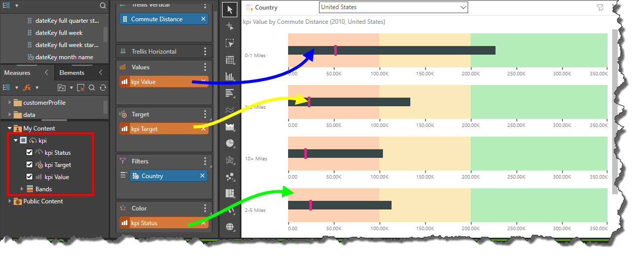 To build a bullet chart on-the-fly (without building a KPI in Formulate), start by adding a hierarchy to the Trellis Vertical drop zone. Add your actual measure to the Values zone.