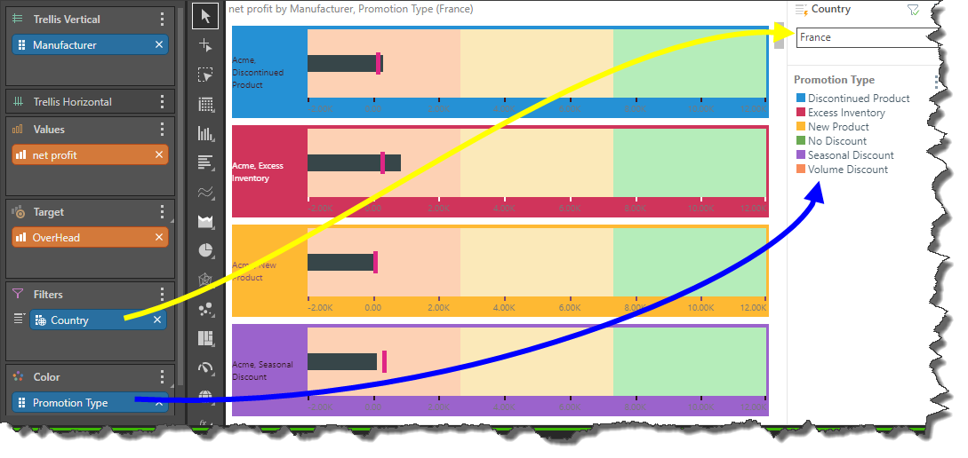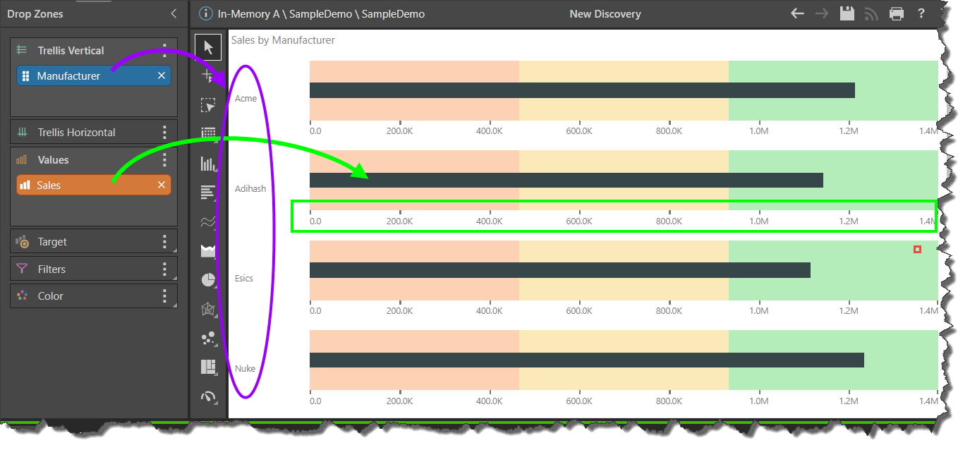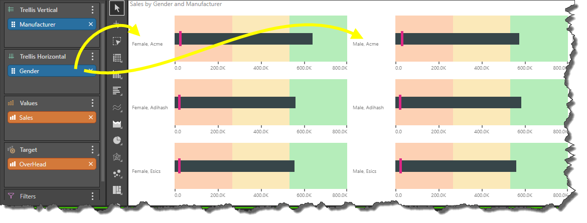 In the image below, we see that the Manufacturer hierarchy was added to the Trellis Vertical zone, driving the vertical trellising of the chart (purple highlight); each chart represents an element from the Manufacturer hierarchy.