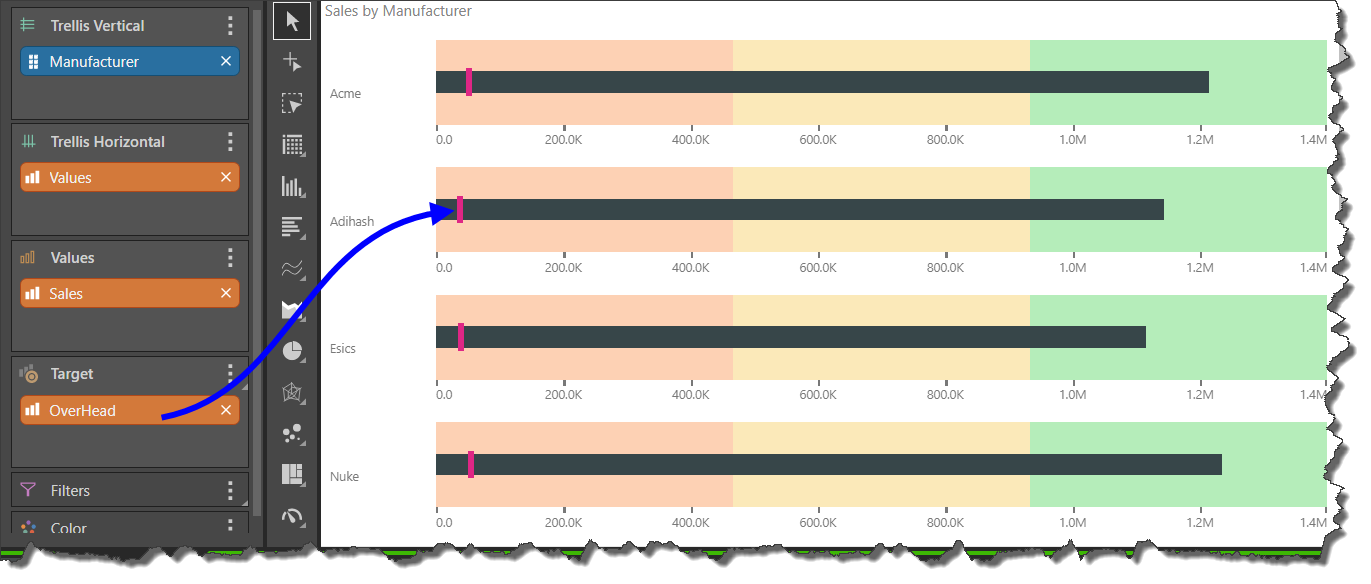 At this point, you need to add a second measure to the Target drop zone to drive the marker on each bar, which indicates the value of the target. Here, Overhead was added (blue arrow).