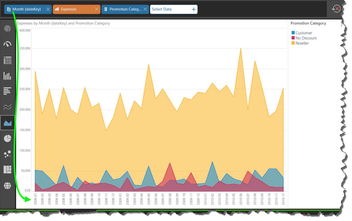 You can add a date-time calculation as a hierarchy selection, or as a filter selection. The former option allows you to add the date-time calculation to the visualization as any other hierarchy. This is useful if, for instance, you want your visual to display a trend over time. For example, the visual below displays expenses for promotions; adding the full month calculation as a hierarchy added the months to the y-axis, so the visual displays a monthly trend:
