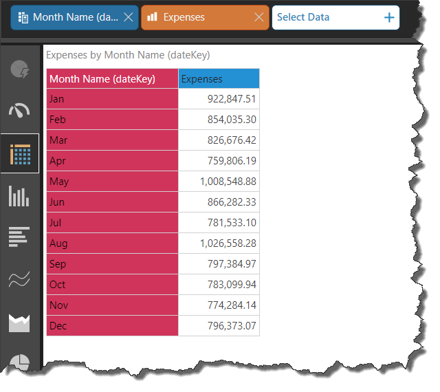 Here, the Month Name date part was chosen as a hierarchy selection, adding all month names to the visual. As explained about, the Month Name date part does not differentiate between years, so this grid displays data by month name for all years:
