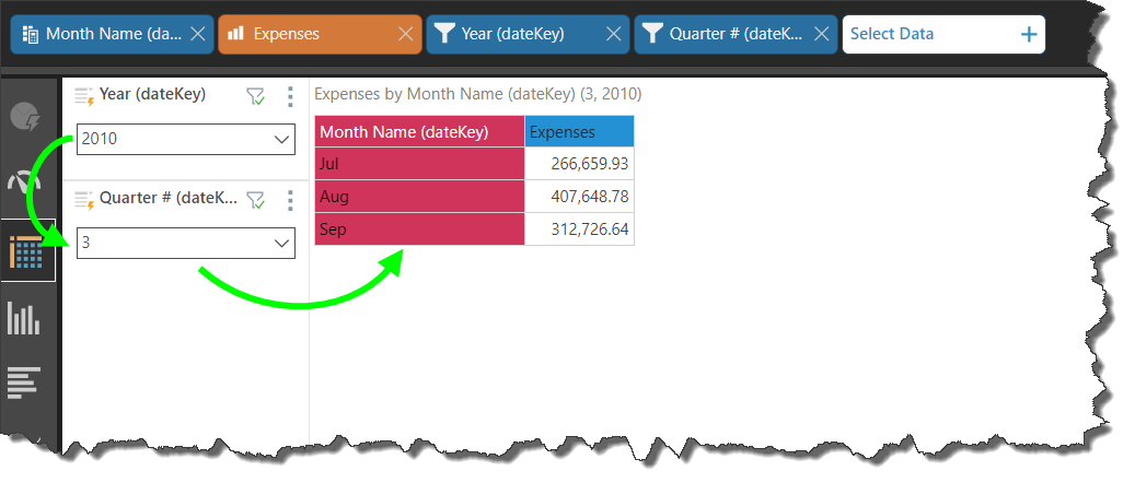 Next, the Quarter Number date part was also added as a filter selection. The year 2010 was selected from the Year filter, and Q3 from the Quarter filter; the result is that the visual is filtered to display the month names for the months in Q3, 2010: