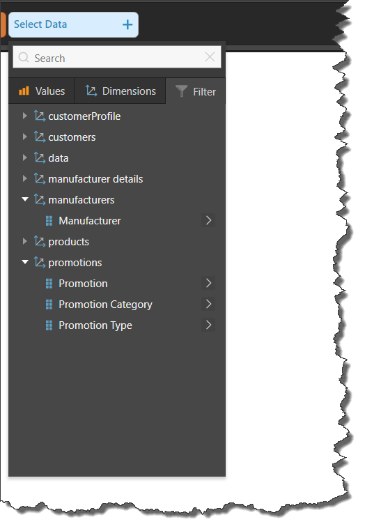 Dimensions represent the tables in the data source, and constitute the quantitative data in the model. The Dimensions tab is accessed via the Data Selections Panel; each dimension can be expanded to expose the hierarchies contained within them. The hierarchies represent the columns within the tables in the data source.