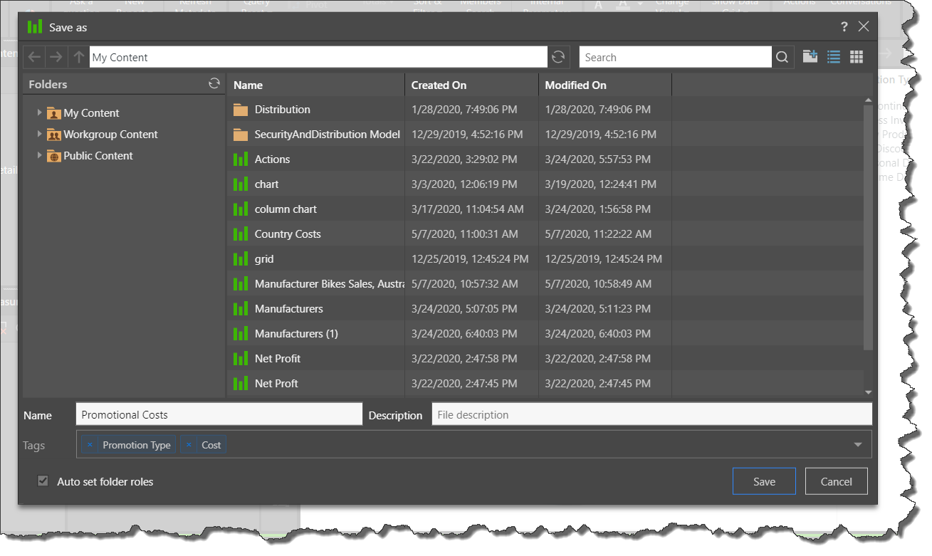 You can manage who has access to your discovery based on the folder in which you save it. The folder tree in the Save As dialog displays 3 main folders: My Content, Workgroup Content, and Public Content. You must save your discovery within one of these parent folders.