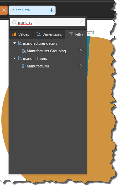 You can continue adding metrics to the query by clicking the Select Data button; once a measure has been added, the Dimensions and Filters tabs are also enabled from the Data Selection Panel, allowing the user to add hierarchies, filters, and slicers.