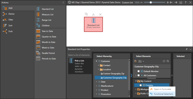 Add the Standard List node to the canvas. From the Select Hierarchy panel, open the Customer dimension, and select the Country user hierarchy selected in Step 2. From the Select Elements panel, click the Fx button to show business logic. Right click on the country parameter and select Functional Selections.