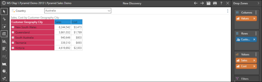 Some functions are only available when working with MS OLAP, Tabular, SAP BW, SAP Hana data models or Regular SQL hierarchies in Pyramid models.