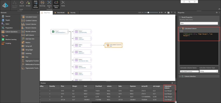 In this example, an If statement is entered into the script window, to generate a new column that will return a result of either High Margin or Low Margin, based on the Margin and Overhead columns. If the margin is greater than 0.3, the calculated column will return High Margin; if it's equal to or less than 0.3, it will return Low Margin: