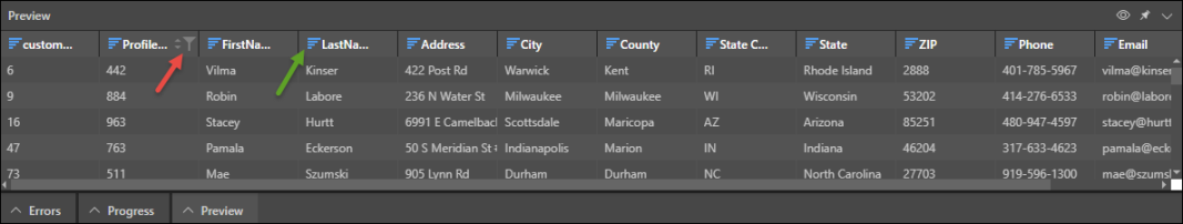 Hover over a column header to show sorting and filtering options (red arrow below). Click the arrows once to sort the preview of the given column in alphabetical order, or twice to sort in reverse-alphabetical order. Click a third time to undo sorting.