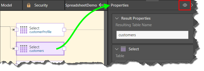 Click the Preview icon (red highlight below) from the Properties panel of the selected table node: