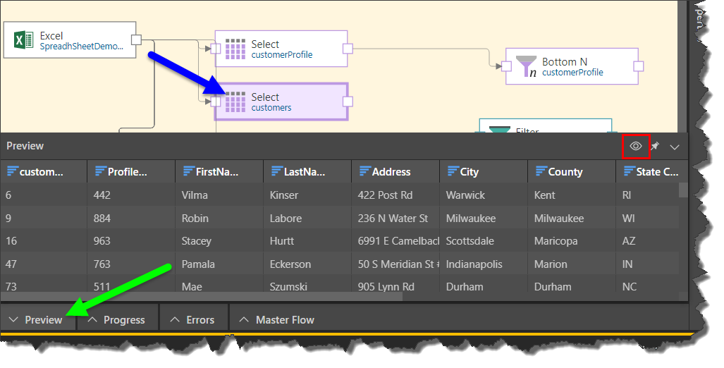 Or click the Preview tab (green arrow below) and select the relevant table node: