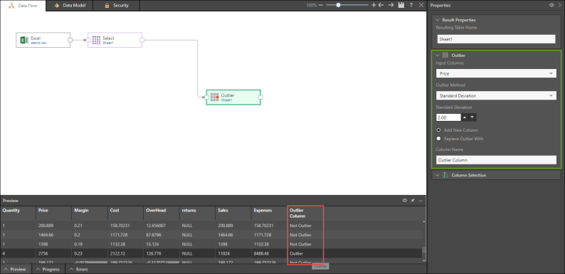 In the following example, the input given is the Price column, and a standard deviation of 2 is selected. The results are displayed in a new column called Outlier Column (in red).