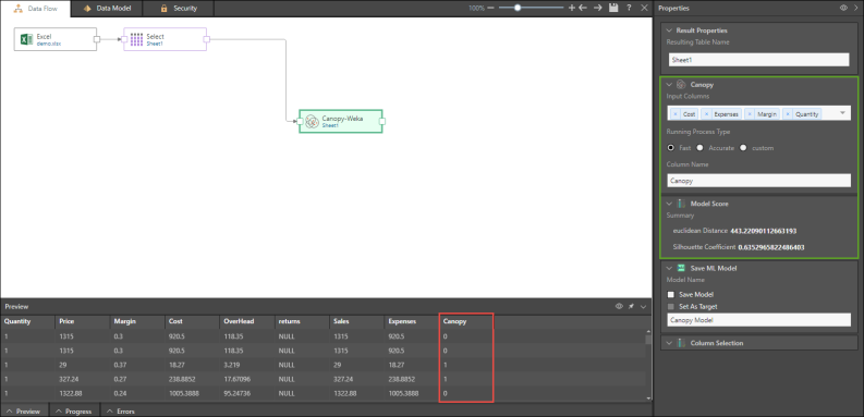 Use the Canopy Weka node to sort large datasets into clusters. The input columns must be numeric. Once you've selected the input columns, select the Running Process Type, and name the new column. The Running Process Type determines the number of rows in the preview.