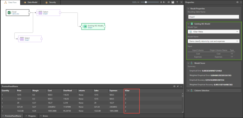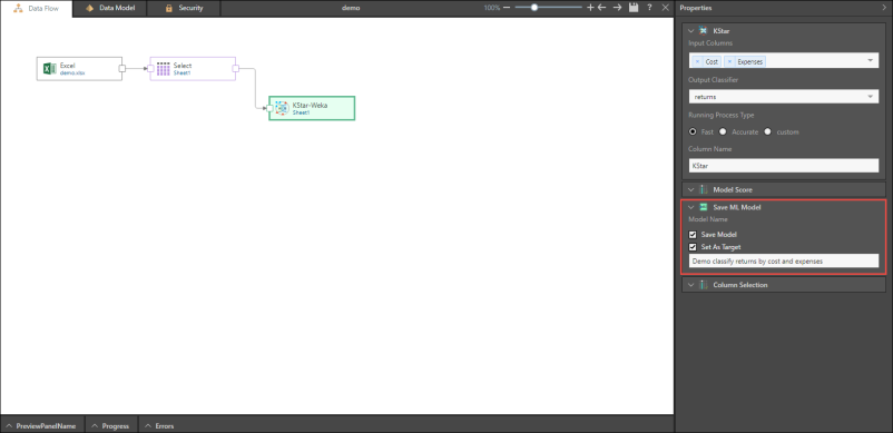 In the example below, the KStar Weka algorithm is used to predict returns by cost and expenses, and the result is saved as a model and set as the target (in red).
