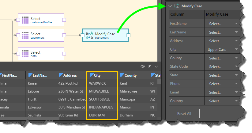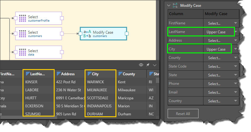 Connect the Modify Case node to the Select node representing the relevant table. Go to the Properties panel to configure the node from the Modify Case window. The window presents a graph showing the table's columns. From the 'Modify Case' column set the case for the corresponding column in the table. There are three case options: