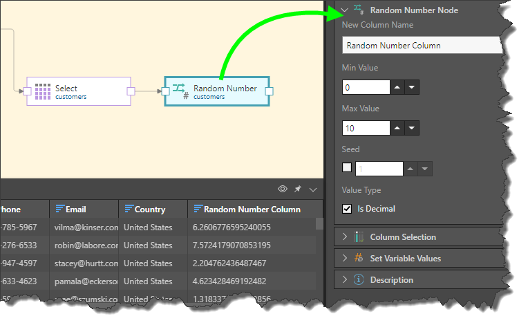 Connect the Random Number node to the Select node representing the relevant table. Go to the Properties panel to configure the node: