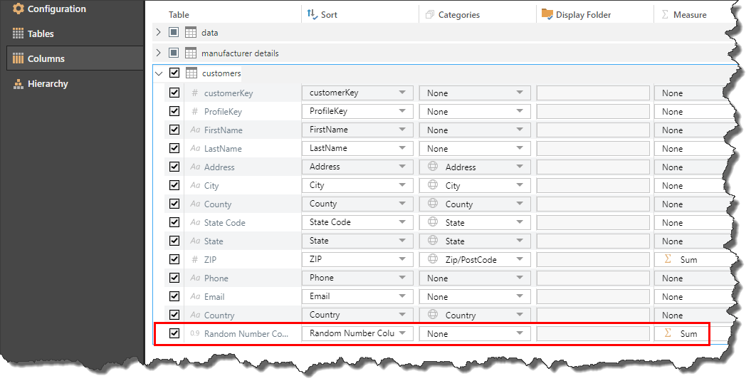 By default, the new Random Number column will be assigned as a measure. If you want it to be used as a column, go to Tables or Columns and make the column visible (by selecting its check box) and assign it to the measure type 'None'.