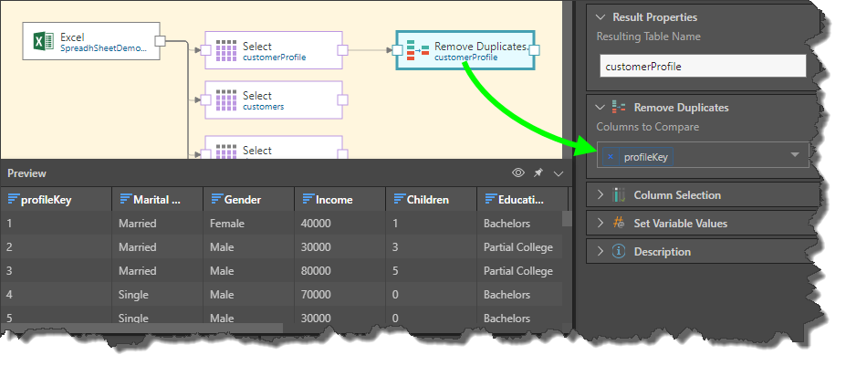 Connect the Remove Duplicates node to the Select node representing the relevant table. Go to the Properties panel to configure the node: