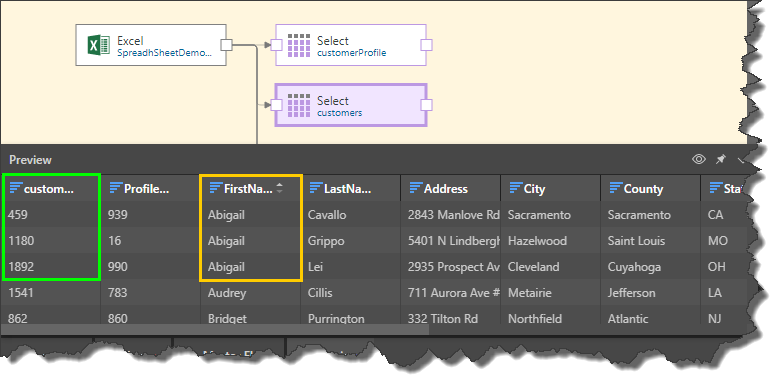 In this example, we have three duplicates in the FirstName column (orange highlight below). However, as we see in the customerKey column (green highlight), these rows are not consecutive: