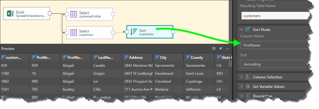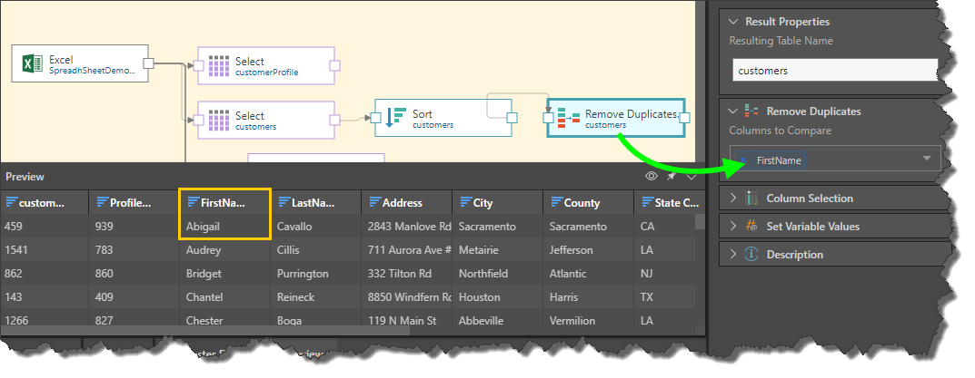 The Remove Duplicates node is then connected to Sort node, and duplicates removed from the FirstName column:
