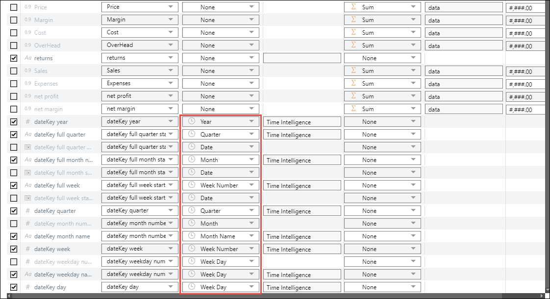 Configuring Time Intelligence at the data flow stage creates additional logical columns and places them into a separate time intelligence display folder. It also enables the building of date hierarchies later on, which is important if you want to enable drill functions for dates.