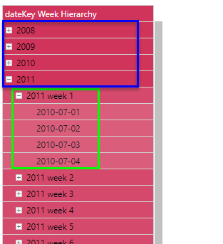 Users can create queries based on any of these new date/ time groupings, rather than relying on the original date-time column. As we see below, this makes date/ time analysis much more user-friendly and manageable. In the following grid, we can navigate between year, quarter, month, and date levels:
