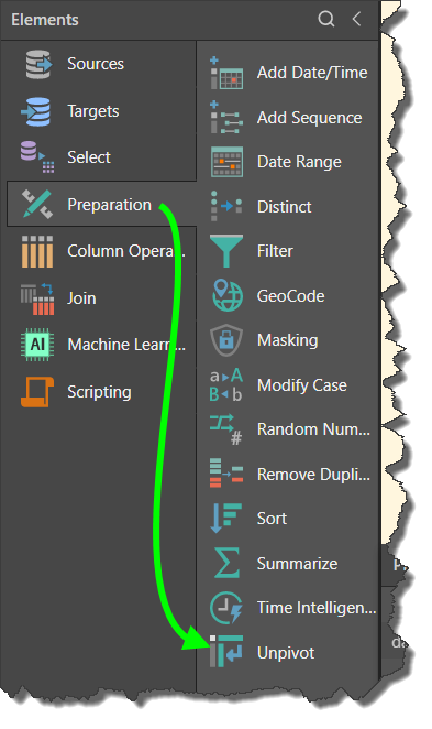 In order to convert the cross tab grid into a tabular format, the Unpivot node must be added. Find the Unpivot node in the Preparations tab: