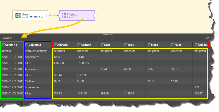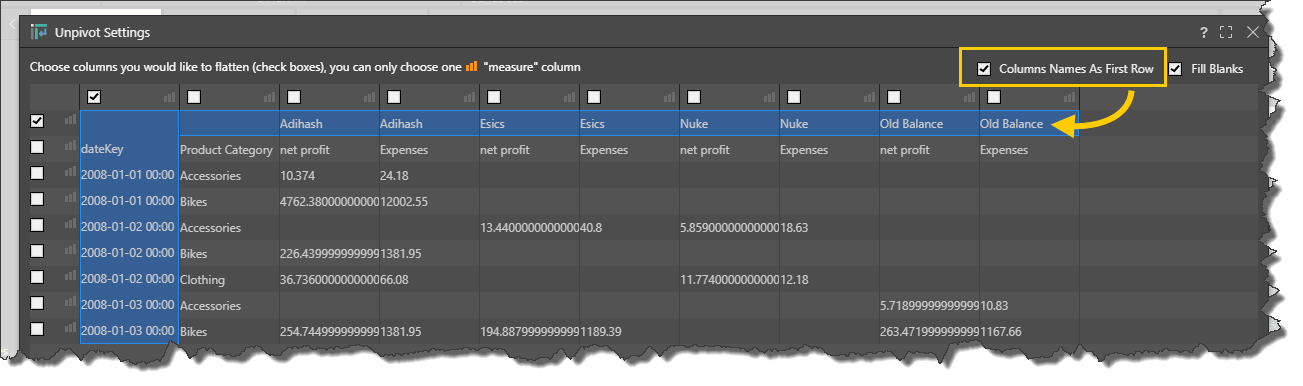 In this example, we have 2 columns consisting of row headers in the crosstab format: these are dateKey and Product Category, which are the 2 left-most columns which are selected and shaded in blue in the image below. These both need to be converted to columns, as does the row containing manufacturer headers. To convert this categorical data into tabular columns, select the corresponding checkbox (blue arrows below).
