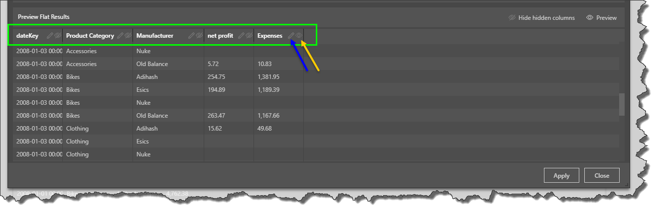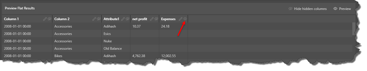 From the Flat Results Preview, click a column's edit icon (blue arrow below) to edit the column name, or click the column's hide icon (yellow arrow) to hide the column.