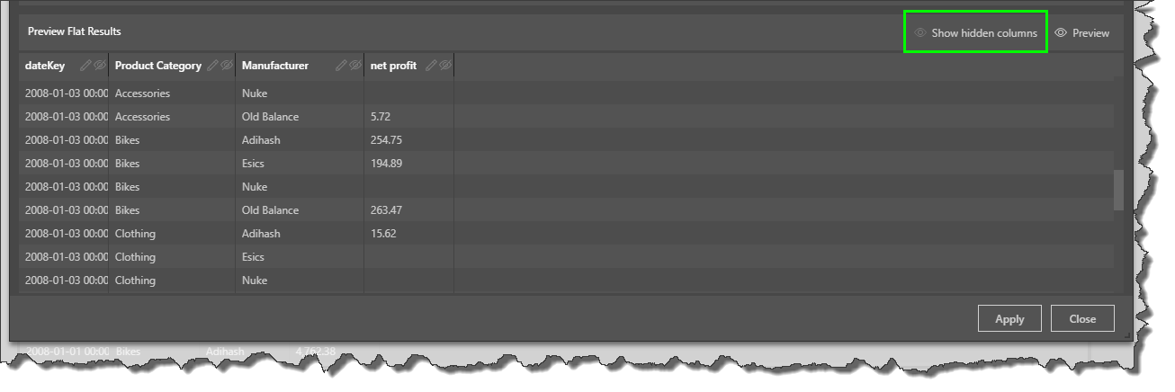 In the results preview, we see three tabular columns for dateKey, Product Category, and Manufacturer (orange highlight). We also see a Value column containing the Expenses and Net Profit headers; these values must be converted into columns.