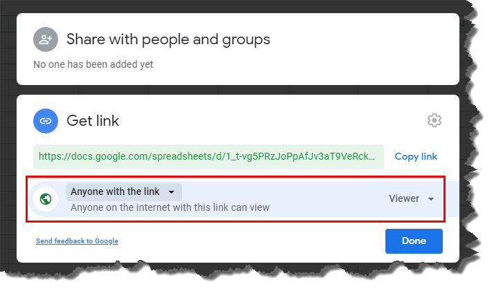 You will be presented with the following pop-up; under 'Get link' choose 'Anyone with link', then click 'Copy link'.