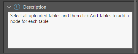 Expand the Description window to add a description or notes to the node. The description is visible only from the Properties panel of the node, and does not produce any outputs. This is a useful way to document the ETL pipeline for yourself and other users.