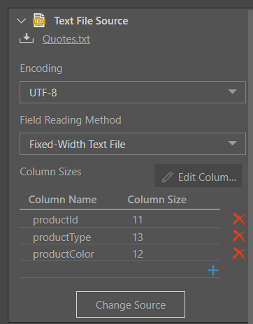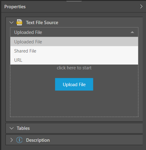 Upload or connect to a Text file and convert the data into a table. The Text file source supports local file upload, or pointer to a shared file on a network drive, or URL address of a text file. Both Fixed Width Column files and Delimited files are supported.