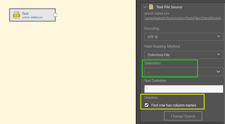 Once the shared file path is provided, the file properties must be set. Because this is a comma separated file, the reading method is set to 'Delimited File' and the comma delimiter is selected (green highlight below). And as each column contains a header, the 'First row has column names' option is enabled (yellow highlight):