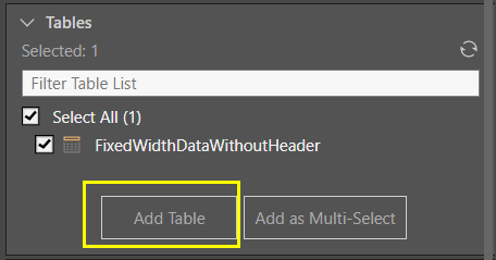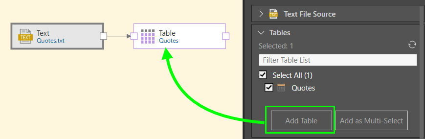 Pyramid connects to the file and converts it into a table, which is then added to the data flow using the Add Table function (yellow highlight below):