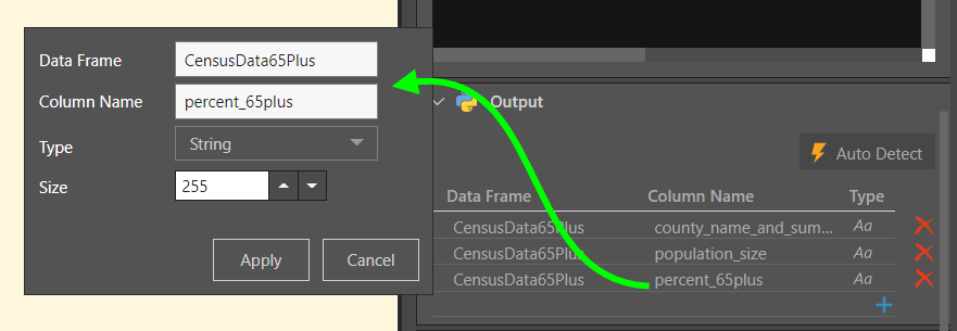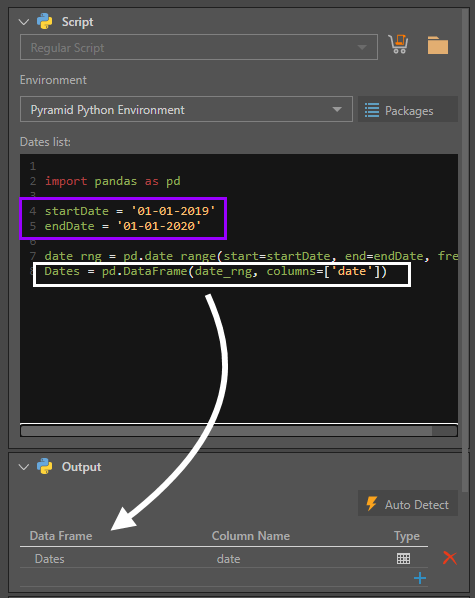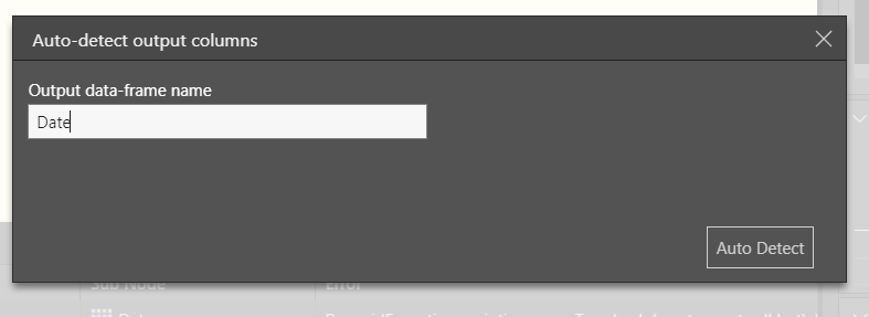 Click 'Auto Detect' from the Output window to open the 'Auto-detect output columns' dialog, where you can enter the data frame. Pyramid will then detect the given data frame and its columns in the script, and add them to the output list.