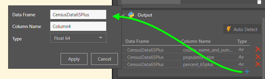 To add columns to the output list manually, click the plus icon (green arrow below). You need to specify the data frame, column name, and data type.