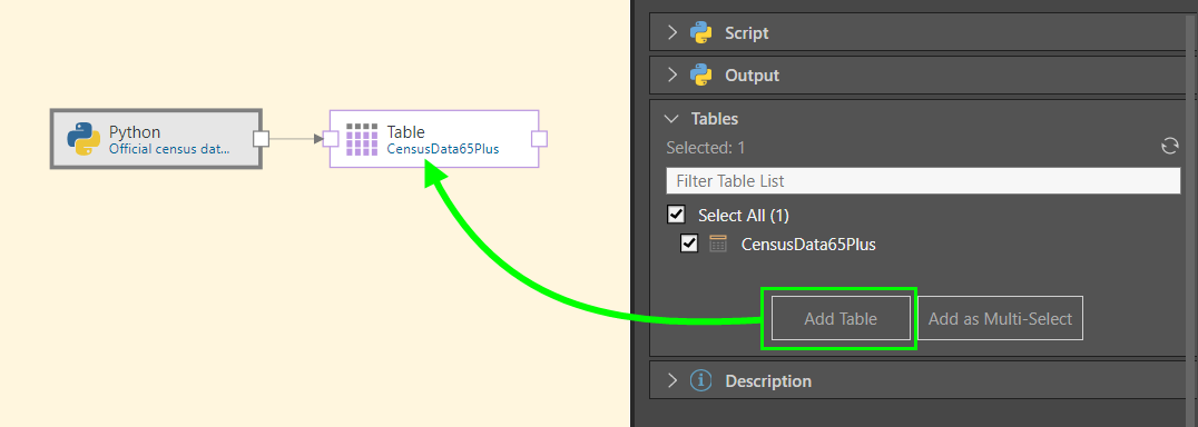 Add the Python source node to the data from and then go to its Properties panel to configure the script.