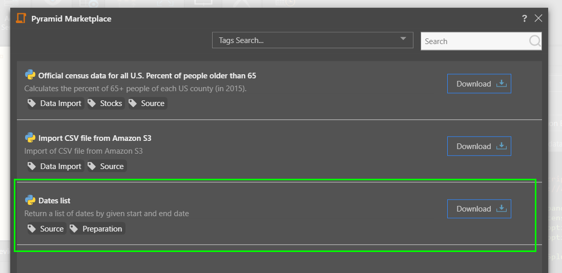 In this example, the Dates List script is downloaded from the Pyramid Marketplace to create a list of dates.