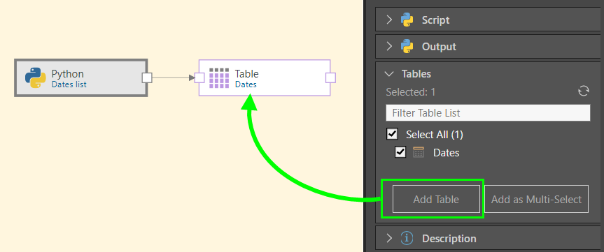 Next, the new Dates table was connected to the source node by clicking the Add Table button: