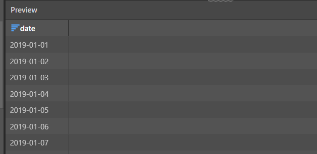 When the new Dates table is previewed, we see the list of dates that was generated by the script: