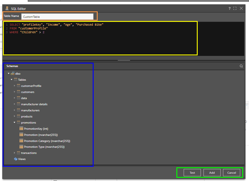 Using the relevant buttons (green highlight), test your script, add the table to the data model, or cancel.