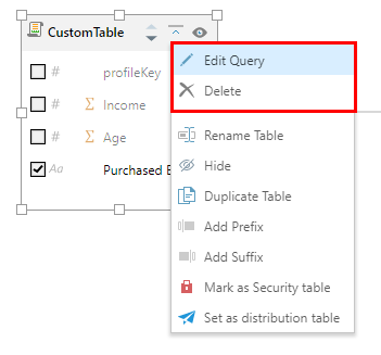 To edit or delete a custom query table, right click on it and select 'Edit Query' or 'Delete' from the context menu: