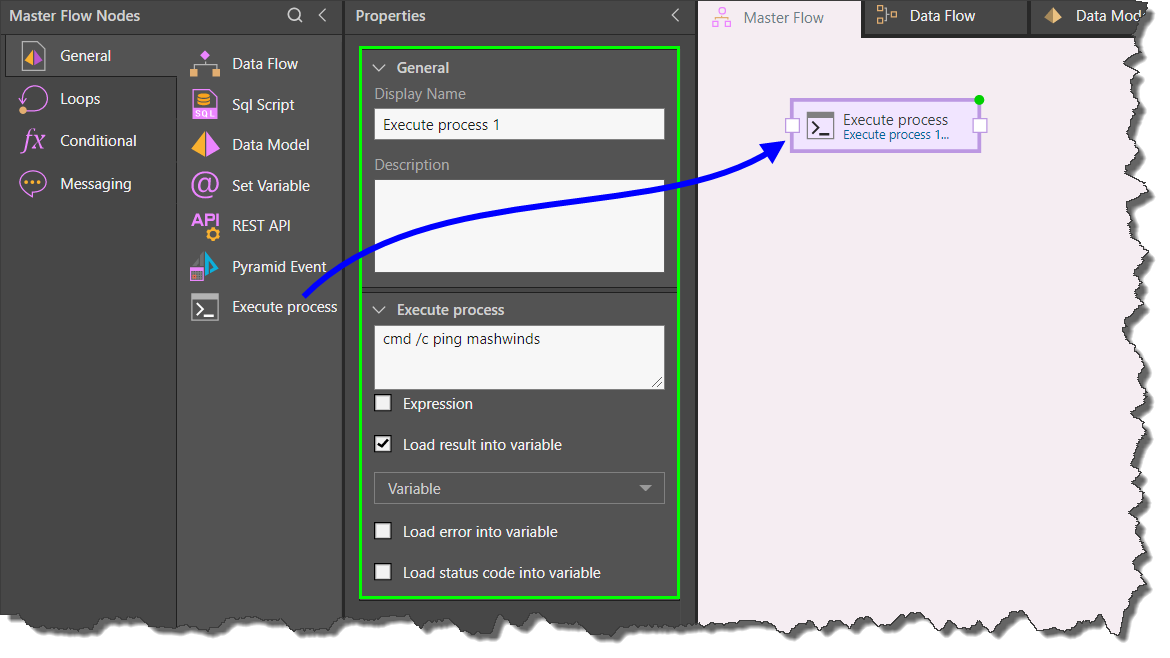 To execute commands, add the Execute Process node to the master flow (blue arrow below), and configure its properties (green highlight below).