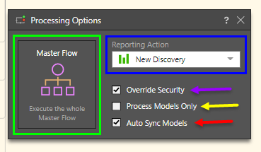 Master Flow: (green highlight below) process the entire master flow and all of its components.