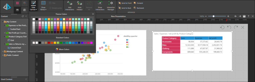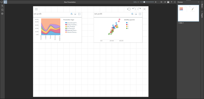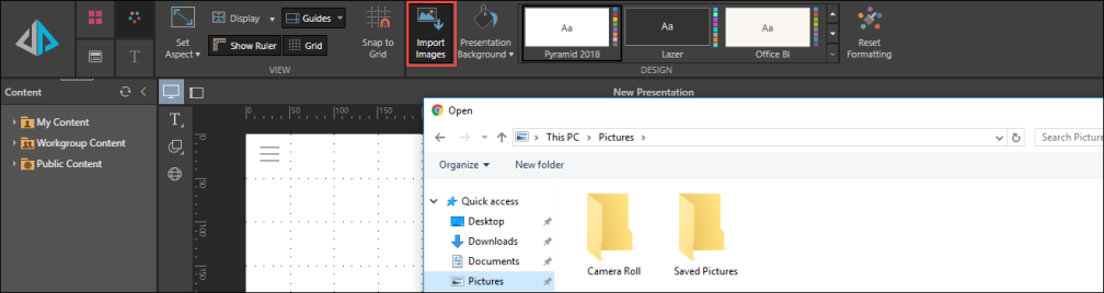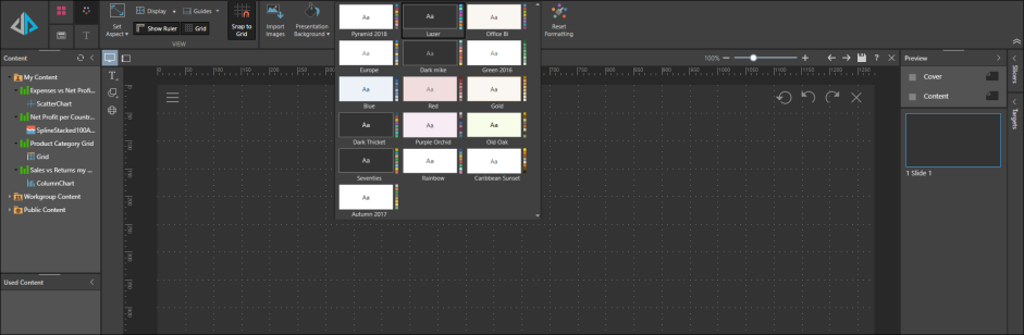 If working with a fixed layout, the Snap to Grid button can be enabled or disabled. The Snap to Grid function is used to easily place visuals along the grid lines.