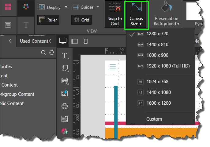 When working in the desktop layout, the canvas size can be changed from the Design ribbon. The Canvas Size drop-down is only exposed when working with a fixed layout. Users can select one of the canvas size presets, or select 'Custom' to configure a custom canvas size.