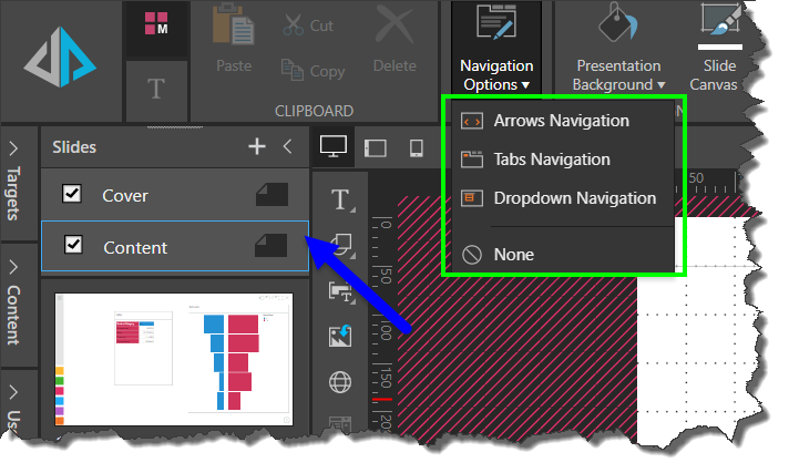 Click on the content or cover template (blue arrow below) to expose the Navigation Options dropdown is exposed in the ribbon. The dropdown offers several options for customizing your slide navigation (green highlight).