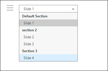 This option adds a drop-down menu to the presentation, from which the required slide is selected. Like the tabs navigation, this is a good option for navigating very large presentations. It also makes it easy for the user to select whichever slide is of interest to them. Depending on the size of the number of slides and sections in the presentation, dropdown may take up less real estate than the tabs.
