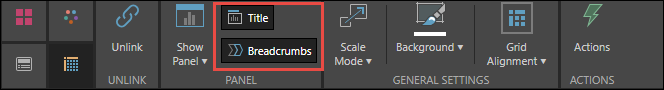 By default, panels contain both the visualization Title and Breadcrumbs, but these can be disabled by click their respective buttons in the Component ribbon.